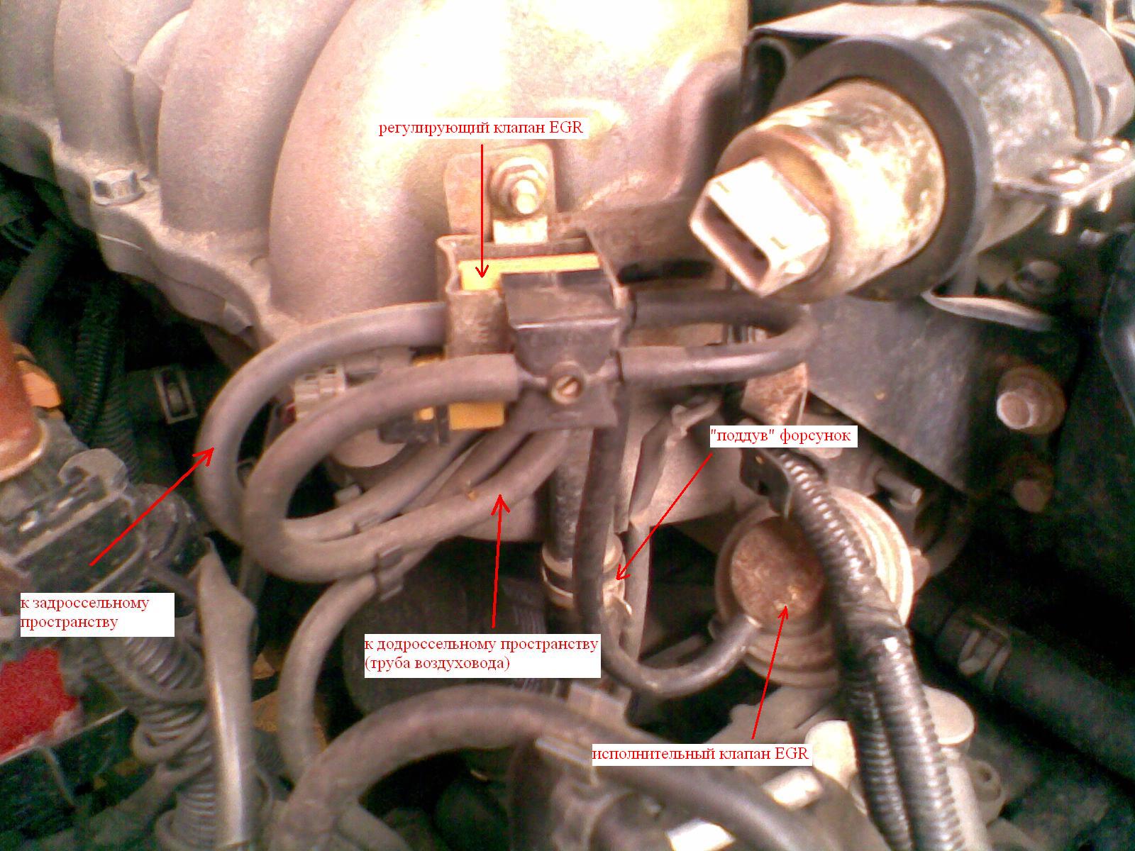 Виктор, ни чего этого нет Демонтирован полностью! Стоит проверить не остались ли на впускном коллекторе не заглушенные вакуумные трубки после удаления. EGR использовал две магистрали (трубки): одна подключалась до дроссельной заслонки (в трубу, в районе РХХ), вторая - после дроссельной заслонки. -------------------- Был 98г. 2.0 DOHC, бензин, МКПП
