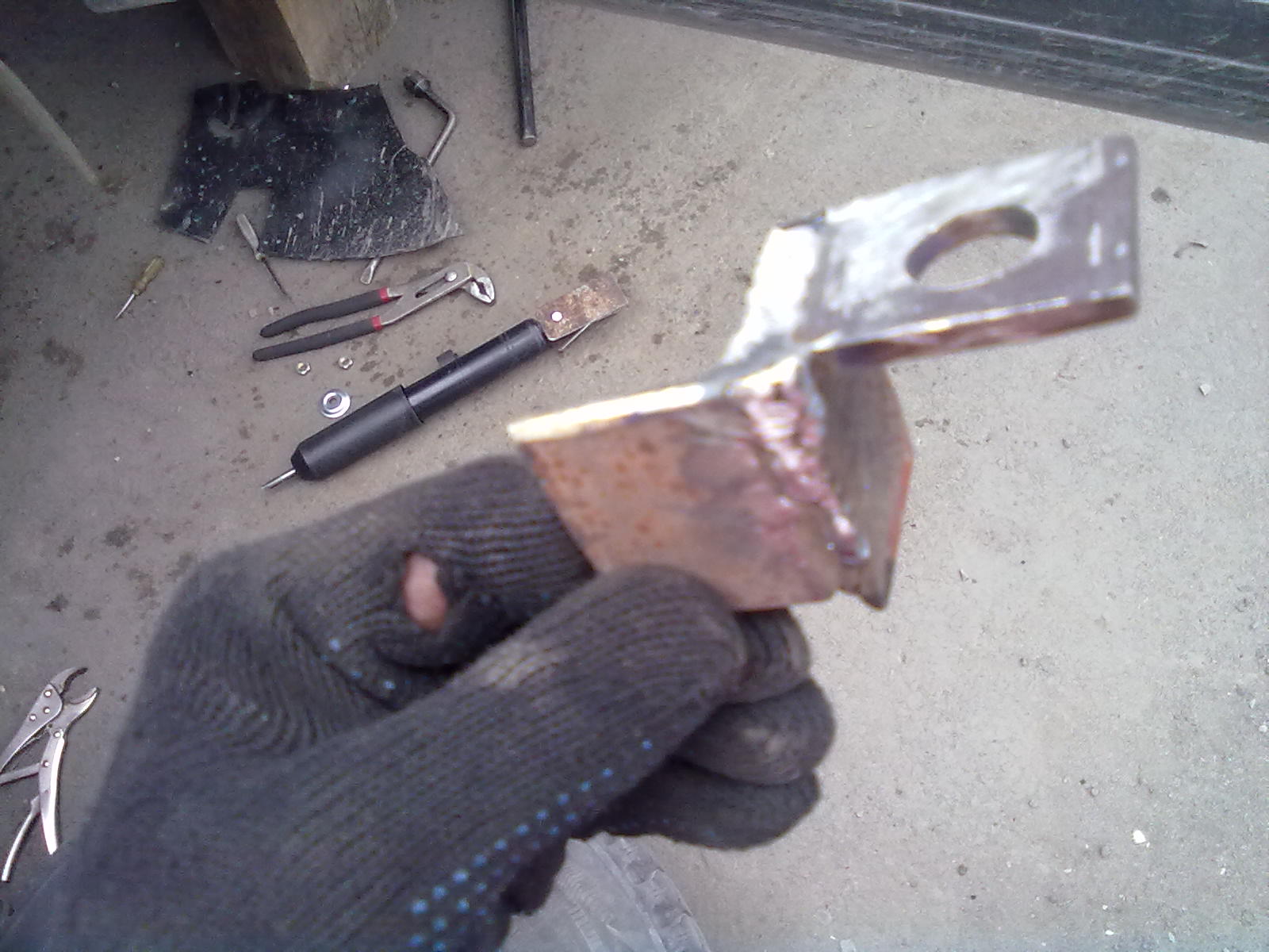 Амо купил от волги, не помню уже какие, где то тут на форуме читал, такие уже ставили. Нижнее штатное крепление было выбито и мартер крепился снизу болтом на 10 Установку делали не снимая стойки, балгаркой делали прорези потом долго мучились их выгибать, сначало этим ключом после чего догадались взять это ключ и дело сдвинулось с мертвой точки Дальше планировалось варить полу автоматом к стенке стакана, верхнее крепление как на фото у Butafor, но почему то меня это все смущяло и я решил немного переделать крепление, взяли второй уголок тот что слева - это я заранее приготовил, а тот что справа - сделали уже на месте, потом мы их сварили вместе вот так вот как это смотрится на амортизаторе после чего приварили все куда следует вот приварили низ а так смотрится в сборе -------------------- http://travel.drom.ru/26190/