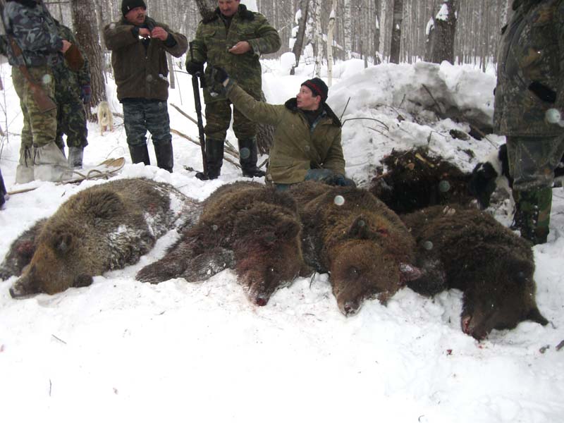 Все легально) Мать и 3 медведя в одной берлоге! Охота проходила в тайге на севере Томска. Пытались выгнать 4 часа, первым вышла не мать, как это обычно бывает, а медвежонок. Шкурки супер, мясо вкусное, жир по баночкам) А адреналина на год хватит! Вообщем поездка удалась, жаль только места труднодоступные, на снегоходах 2-3 часа от норм. дороги. а летом вообще не проходимые. А отстрел у нас не запрещен, т.к медведей очень много, в деревни заходят, скот дерут. -------------------- 2002 коротыш Кал МКПП бензин