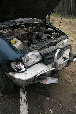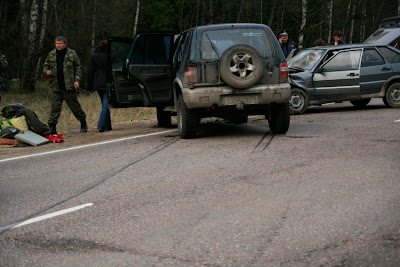 - Ехали по большой бетонке в сторону Сергиевого Посада - не доезжая километров 20-ти им на встречу вылетела Шевроле Лачетти - Сергей вильнул вправо, к обочине, и стал оттормаживаться. Шевроле - тоже повернул на обочину. Сергей крутанул влево. Вылетел на встречку. Там врезался в ВАЗ-2114. Женщину-водителя жигулей увезли с сотрясением мозга. Сами все целы. Слегка поцарапаны, но ЦЕЛЫ. Скорость при ударе была не больше 40 км/ч Повреждения - оба радиатора, бампер, капот, кенгурин, крыло, передний "телевизор" .... Двигатель цел. Самое гнусное, что Сергей этого на Шевроле даже не царапнул. У того вообще никаких повреждений. Мед.освидетельствование уже прошли - трезв. Сейчас едут в Москву, везут машину в "Климавто". З.Ы. Может сумбурно и не точно. Сергей позже уточнит. Еще раз повторяю - все целы. -------------------- Mitsubishi Pajero Sport. 3.2d, SS, 2008. синий. лифт подвески +40мм. бокс на крыше.
