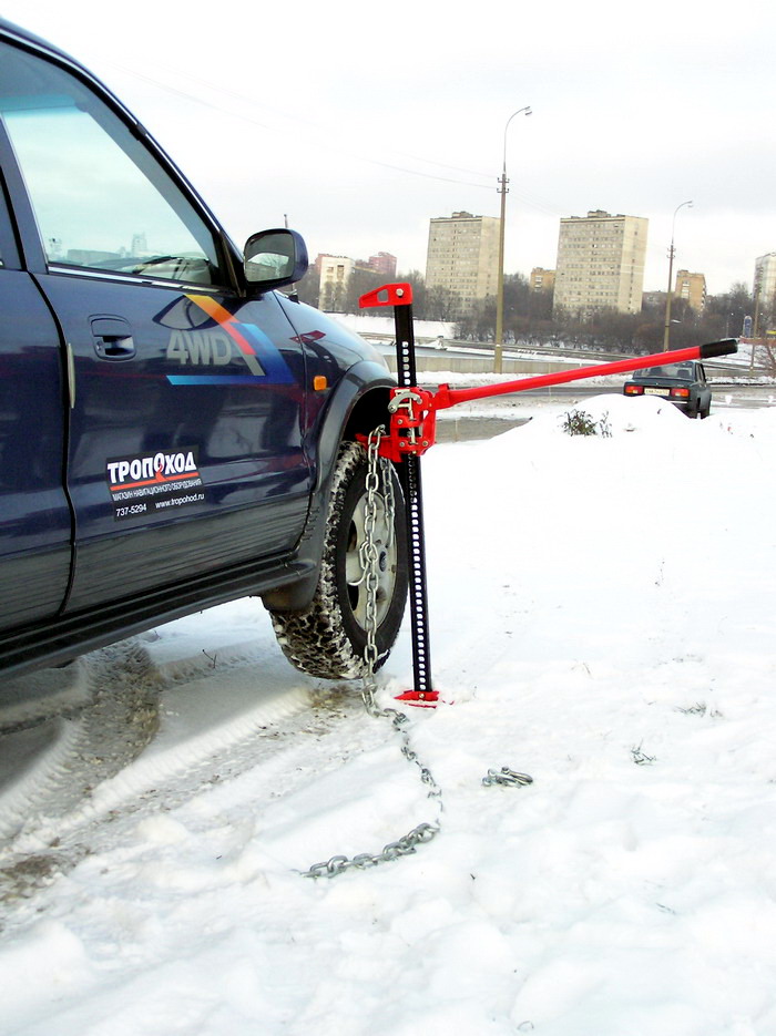 Идея проста - цепь для ручной лебедки (она уже у меня была) и две такелажных петли (не знаю точно как они называются) В результате получаем такую конструкцию: Потом цепляем петли за колесный диск и вперед! ... точнее - вверх! К свободе! У этой конструкции, по-моему, есть преимущество перед "фирменным" девайсом - можно менять длину цепи. И еще - цена. Осталось только придумать, как зафиксировать цепь на клюве хай-джека, чтобы она не могла слететь ... хотя это и так маловероятно ... -------------------- Mitsubishi Pajero Sport. 3.2d, SS, 2008. синий. лифт подвески +40мм. бокс на крыше.