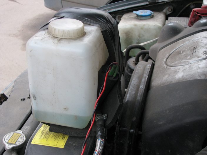 Выкладываю свежий фотоотчет Бачок ВАЗовский 2 литра обмотан теплоизоляцией Армафлекс (вспененый каучук) Отверстие под насос аккуратно рассверлено и установлена прокладка из комплекта СКИФ Для установки бачка выпилен из алюминия кронштейн и закреплен параллельно кронштейну генератора Бачок одеваем на кронштейн сверху Насос впритык проходит воздуховод -------------------- Гранд 2003 Калининград 2,0 механика