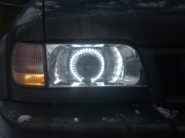 Результат ..... Афффигеть! Как я раньше два года ездил???? С включенным ближним: А это теперь у меня такие "габариты" Светотеневая граница ближнего: Как говорится - "Комментарии излишни" Вокруг модулей приделал "ангельские глазки" из светодиодных лент. Причем, светодиоды "направленного действия. . Вот как ЭТО впотьмах выглядит ... В общем, по городу могу теперь ездить вообще без ближнего От этих светодиодов свет такой, как от стандартных фар, заляпанных жижей с дороги -------------------- Mitsubishi Pajero Sport. 3.2d, SS, 2008. синий. лифт подвески +40мм. бокс на крыше.