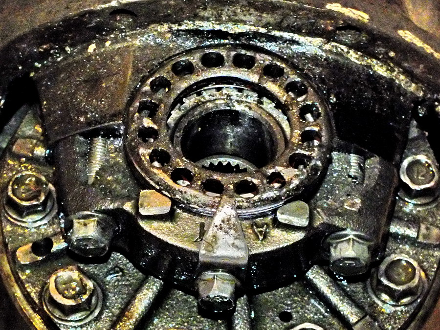 Снял сегодня задний мост.... Еще раз хочу сказать - СЛАВА ГРАФИТКЕ!!! - все болты продольных тяг и тяги Панары открутились и вынулись без проблем, будто я их неделю назад закручивал. Тормозную систему на стал "вскрывать" - тормозные щиты с колодками подвесил на веревочках к багажнику Мост вынул из-под машины вместе с редуктором и уже в более-менее человеческих условиях принялся за извлечение редуктора из чулка. Сначала из моста вывалилось вот это: "ЭТО" оказалось куском крышки полуосевого подшипника дифференциала Дальше, после часового орудования кувалдой, удалось закрутить гайку , редуктор вылез из чулка..... ... классика жанра .... Ну а причиной вылезшей гайки стало вот это: Шестерня отдельно, сателлиты отдельно. В общем, порвал я дифференциал...... Кстати, на зубъях главной пары только на большой шестерне на двух зубах небольшие заусенцы, а так шестеренки вполне в приличном состоянии. Подшипники "морковки" нормальные. В принципе, можно было только поменять сам дифференциал и можно ездить.... Но я уже нацелился на блокировку от mukkassey`я..... -------------------- Mitsubishi Pajero Sport. 3.2d, SS, 2008. синий. лифт подвески +40мм. бокс на крыше.