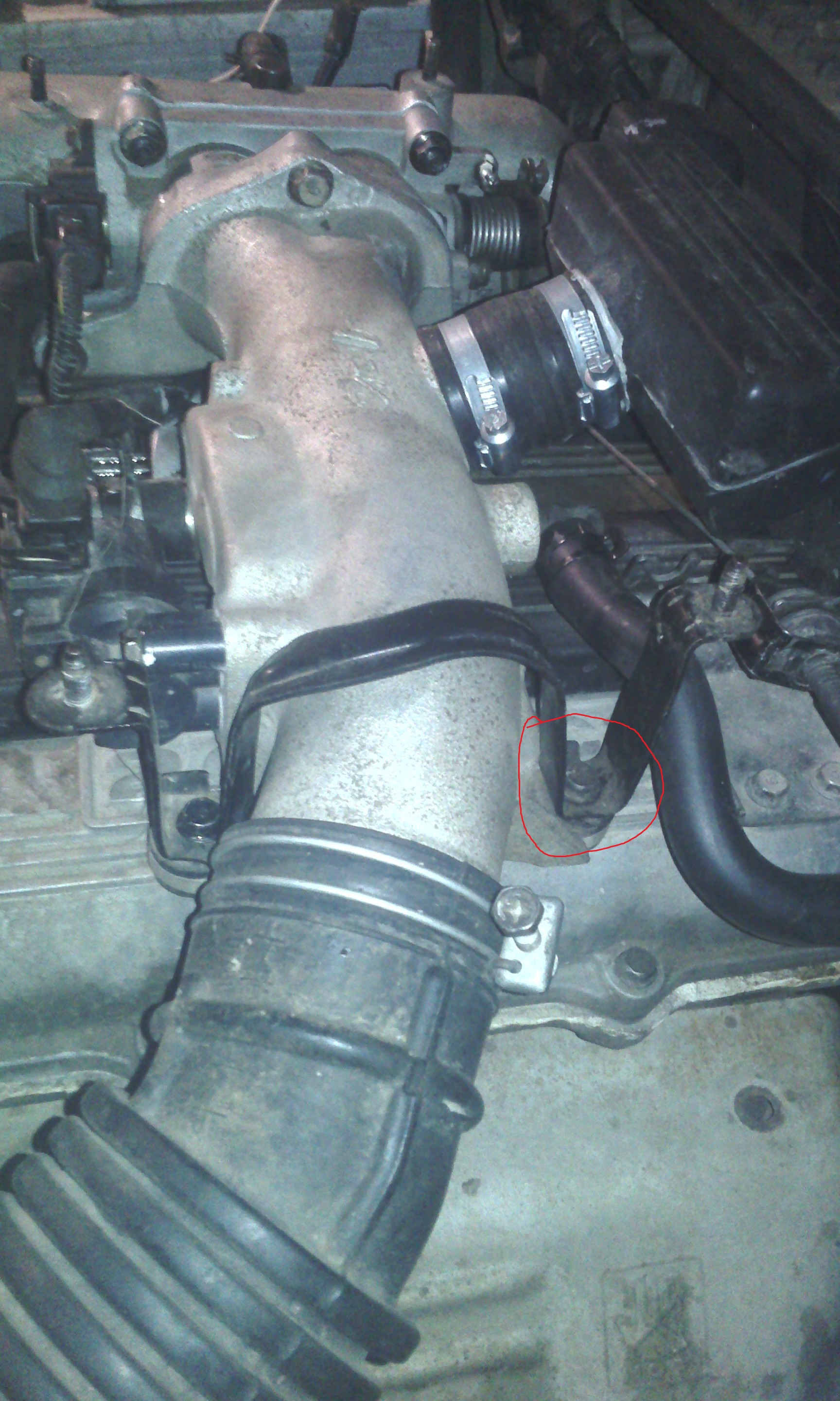 Снята пластикая накладка сверху двигателя, демонтировал так же и её крепление, проверял на подсосы- нашел в шланге и вот здесь. Без болта воздух напрямую шпарит...