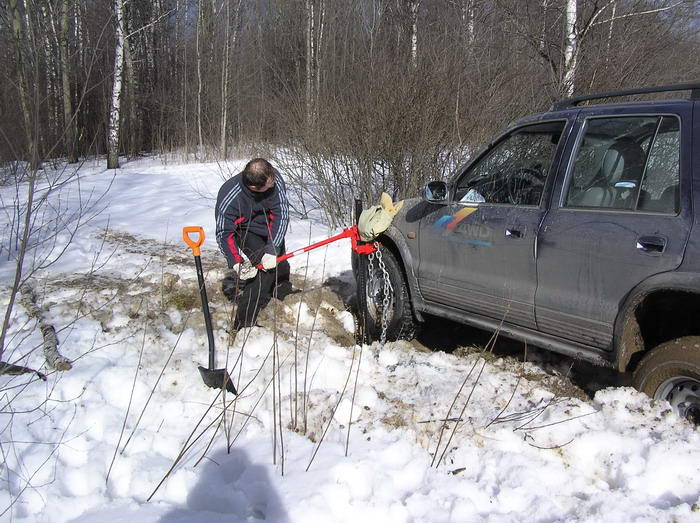 Машина стала действительно смотреться более серьезно Резина имеет размерность 235/75 R15, что при существующем лифте в 5 см как раз. Естественно, после установки резины возникло желание тут же ее испытать. Поэтому решено было поехать на полигон около Шереметьево-1, где собирались корейские внедорожники 24-го февраля. Надо сказать, неделя дождей сделала свое дело. Снега практически не осталось, а там, где он был.... по большей части это был лед: НО там, где снег остался, машина "прет" Но мы все-таки нашли свою "канаву", решив проехать к опушке напрямую, чтобы расположиться на перекус... Сначала решили подкопаться... Но быстро поняли, что так нам не вылезти ... результате был использован всесь арсенал снаряжения, что был в багажнике.. Особенно порадовало сочетание лебедки и динамической стропы. Когда выяснилось, что машина сидит крепко и усилия, чтобы вытащить лебедкой, не хватает, прицепил к ней вместо стального троса динамическую стропу (на 9т). В результате, работая лебедкой, натягивал стропу, а потом, газуя назад, пытался выехать на твердое место. Буквально за два приема удалось машину выдернуть из трясины. Надо сказать, что резина пытается грести, пока есть хотя-бы за что зацепиться. BFG AT в этой ситуации просто шлифовал грунт. А уж как далеко кидается землей... Позже решил прокатиться по лужам, но малость не рассчитал толщину льда. Лед оказался гораздо толще, чем я думал. Результатом стал погнутый передний номер и помятые соты радиатора кондиционера. ... хотя сам радиатор остался цел Хорошо хоть хватило ума не сунуться в эту лужу со всего разгона, как в прошлый раз. А заехал по-тихоньку. Но и этого оказалось достаточно.... Теперь надо ставить защиту перед радиатором. Ну а позже устроили покатушки по оставшимся сугробам. Под конец жена тоже не удержалась и проехалась несколько кругов по трассе. И была в диком восторге от ощущений. -------------------- Mitsubishi Pajero Sport. 3.2d, SS, 2008. синий. лифт подвески +40мм. бокс на крыше.