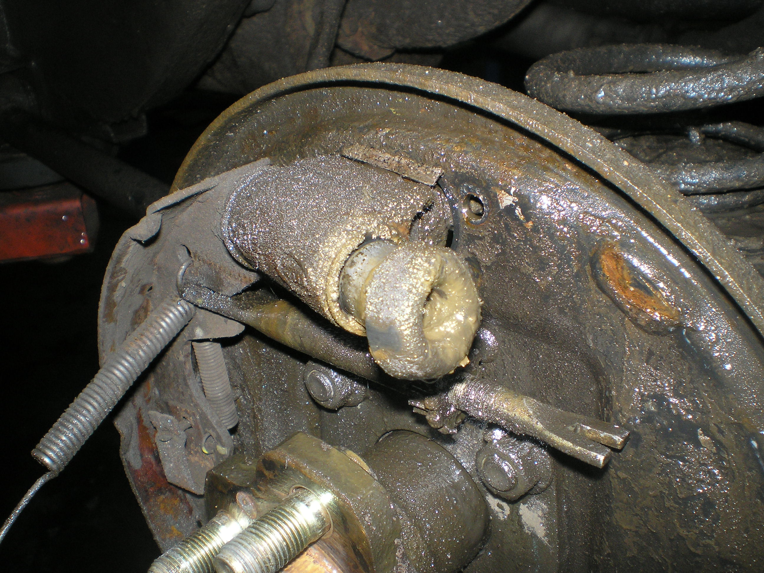 Как и предполагалось, отлетела накладка и вылетел поршень в левом заднем тормозном механизме. Кроме того, сам тормозной цилиндр вырвало со щита Доставил машину к девяти утра на Ворошилова на эвакуаторе, где-то пол-одиннадцатого машина стояла на подъемнике. К двенадцати все было готово (замена цилиндра, колодок справа-слева, стоек стабилизаторов и моторного масла - уж заодно). Эскизы прикрепленных изображений -------------------- Ротор поля наподобие дивергентсии градуирует себя вдоль спина и там, внутре, обращает материю вопроса в спиритуальные електрические вихри, из коих и возникает синекдоха отвечания.