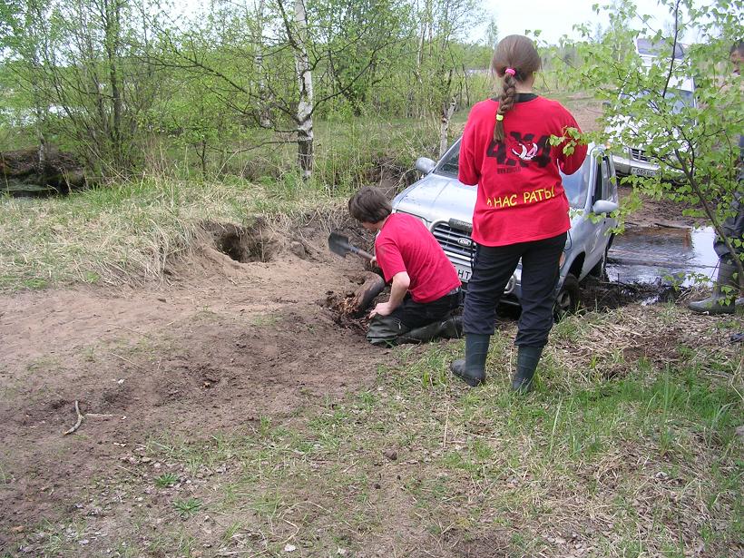 правда через сто метров мы чутка колбаснулись, а еще чуток подальше немного поплавали, но это ничего решили мы и продолжили путь в надежде, что дальше будет суше. к 16-00 мы все же добрались до брода и сели там на час. Да, переезжали мы его вдвоем чуть больше часа. Спасибо местному рыбаку у которого оказалась вдруг с собой бензопила Далее завалив пару деревьев мы въехали в лес Вот уже скоро и высотная дорога - подумал я. Около 17-00 мы подъехали к тому месту где начиналась трасса экстрима 3его мая на "Синявинских высотах 2008" Вообщем-то проехав метров 100 там мы и остались часа на 4. Ни хай-джек ни лопата с ручной лебедкой нас не спасли. Продолжение следует.... |