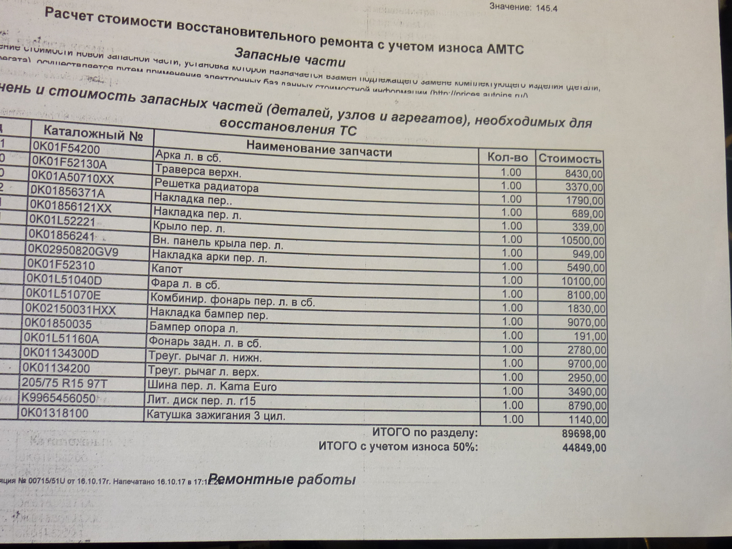 прошу помощи и советов, всех кто был в таких ситуациях, , , при дтп, , , и так далее напомню, , что в сентябре, . я возвращался домой на своём спортаге, , . на перекрёстке произошла беда, , , я ехал на зелёный сигнал светофора, , и всё бы хорошо, , но тока выехал на пересечение, , дорог, , раздался хлопок, , , и спортага оказался вбитый в бордюр, , .что- это было? чудо из деревни маслянское, , , летело на купленном родителями ниссане кошкае, , , на полном ходу, , не сбавляя скорости, , , и долбившись в шары, , , на красный свет сигнала светофора, , долбануло меня как следует, , , он отскочил от меня как мячик, ударился об заднее крыло моей тачки и растележился по середине перекрёстка, , ладно чего- ему выписали 1000руб штрафа оформили дтп, , и отпустили, , , а- у меня начались проблеммы, разбитая красавица кия, , стояла в ограде две недели, , , и ждала когда, , её посмотрит страховая компания, , , так как машина была не на ходу ехать в офис я не смог, , , поэтому они мне назначили такой срок, , ну ладно дождался приехал их ний парень пофоткал всё осмотрел, , вызвали в офис подписал акт осмотра, . с рамой- всё они мне мозги парили, , я им — говорю НАША РАМА- ЭТО ВСЁ, , , а они в ответ у вас рама из кусков состоит, , , везите в челябинск машину, , там армяне в сервисе вам её починят из старых запчастей, , . ну типа такой темы ладно — говорю ему за раму мы ещё потягаемся, , , — считайте за мелочь всю, , он говорит ждите в течении 20ти дней вам начислят, , ну думаю опять ждать до конца октября, , , это же такая тегомотина у них пока всё обсчитают а в итоге- сегодня сижу на работе СПИКАЛО на телефоне смска, , , зачисление от них на сумму 105,658руб, .18 руб, .- ого говорю, , .-надо проверить карту, . в банкомат пришёл вставил точно есть сумма, , после работы погнал в офис, , в страховую, , говорю дайте мне акт калькуляции, , девушка, там уже домой начала сворачиватся, вся заломалась как девственница, . потом как с неба бог послал, , тот друг на тайоте подьехал, . что эксперт у них с офиса- я его увидел, , . одновременно с ним зашли, , , в офис, . я за ним, поймал его говорю как дела с рамой?он говорит вашу раму признали под замену комиссия в челябе типа всё замена рамы никаких ремонтов, , . девушке дал команду распечатать мне акт калькуляции, , , что она сделала- но говорит ты его принеси в понедельник- у тебя будет акт другой со скрытыми повреждениями, , , там у меня бачок расширительный в дребезги радик основной ну и по раме, , решится вопрос думаю, , она у нас не варится и не гнётся тока замена для нихх вобщем едем дальше- в понедельник у меня назначенна встреча с этими товарищами, , — поэтому сейчас ниже скину фотки чего они мне общитали, , вы посмотрите и, , оцените их, , как и что а, я возьму на заметку я, так вот стрельнул по списку, , , вот пример- мне колхозник когда, , , вдарил, , у меня поворотник левый, , с габаритом, , на куски в хлам разлетелся, , одна пружинка тока осталась живой, , , так вот они мне считают так, , , номер этого поворотника такой-0K01L51070E-по их каталогу, и цена ему 1830р а, я этот поворотник не нашёл к сожелению бэушный, , пришлось новый брать, такой-0KO8G51070B-по цене 2532руб, , как это понимать? они чего думают я такой бестолковый, и не знаю коды запчастей на свою машину, , или они такие глупые, что берут с какой то кии, , , я знаю что у нас есть 4 поколения кия спортейдж, , а то и 5ть уже, , но всё же, , , они что ставят от балды коды, , , или как? добрый вечер всем, , , пр