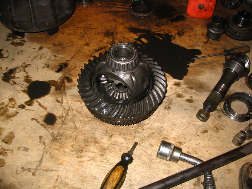 Значит так... Закуплены 5 деталек для замены - 2 подшипника, сальник, распорная втулка и гайка хвостовика. Редуктор был снят, спасибо Мише и Стасу за советы. В принципе, проблем со снятием особых нет. Вытянуть полуоси, немного постучать по хвостовику когда все болты откручены, и редуктор с удовольствием выпадет на ваши ноги или руки(эт как повезет). Дальше все тоже без особых напрягов, ослабляем болты, удерживающие сателиты и откручиваем болты, удерживающие регулировочные кольца. Везде ставим метки - на кольцах, на стороне установки и на кронштейнах. Выкручиваем регулировочные кольца и считаем количество оборотов. У меня с каждой стороны по 5 целых оборотов. Вот с этой гаденькой детальеой пришлось повозиться Я ее взял на работу и выпилив в губках тисков прорези для зажима остатков пошипника, нагрев детальку в кипятке, успешно выбил ее маленькой кувалдой. Бить, разумеется надо по старой накрученной на хвостовик гайке. Потом все собрал в обратной последовательности. Проверять пятно контакта не стал, не хватало катострофически времени. Все посадил на красный герметик, залил почти 2 литра масла и поехал испытывать. Испытания показали, что вой ушел, вибрации пропали, а вот при торможении машины, на малой скорости усилился неприятный эффект. Усилился звук, как буд-то подклинивает тормозные колодки, или что-то не так с ГП. НО! Поскольку барабаны у меня изношены уже вроде как за пределы допусков, то вывод можно будет сделать, только поменяв барабаны. PS Машинка немного прибавила в динамике - все ж люфты в подшипниках эт плохо! -------------------- Рожденный ползать... покупает джип и ползает...