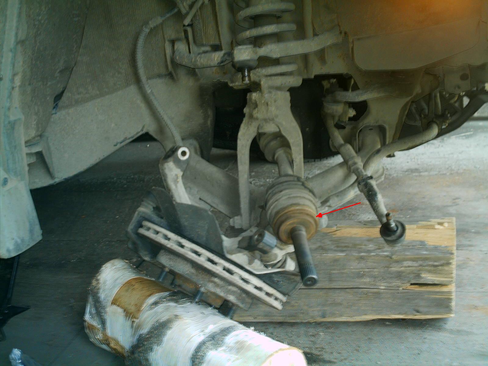 Отключил передок, звуки прошли. Возвращался в домой, по трассе шел на заднем, все ок. Ушел на нечищенную дорогу, включил передок (в машине я жена и ребенок 3 лет, фиг с ними с муфтами, безопастность...). Ну и тоже наблюдал сии звуки особенно при трогание и низких скоростях. Втулки стоят вакумные усиленные, замена была в мае этого года, со слов старого хозяина. Пока все, что он говорил, было правдой. Правда маркировку муфт не знаю. Что бы сие значило. Недавно такую картину наблюдал у себя с правой стороны , все симптомы как ты описываешь. У меня эти звуки (скрежет на малых скоростях) прошли когда прошелся аэрозольным составом (с молибденом) там (см.фото)ни чего снимать как на фото не надо, выворачиваешь колесо и брызгаешь из балончика , я об этом уже где то отмечал . Попадает песок и грязь , затирает под сальник (ИМХО) , попробуй , у меня прошло , а то уже хотел разбирать , хотя от этого хуже бы не было. И второе : как выше ребята высказывались , дистанционная шайба , но тут разбирать и мазать, хотя я сомневаюсь что это тот случай. -------------------- Авто 2000 г.в. американец . АКПП. K08A. Уже не мой :(. я на пузотерке , так вышло ....