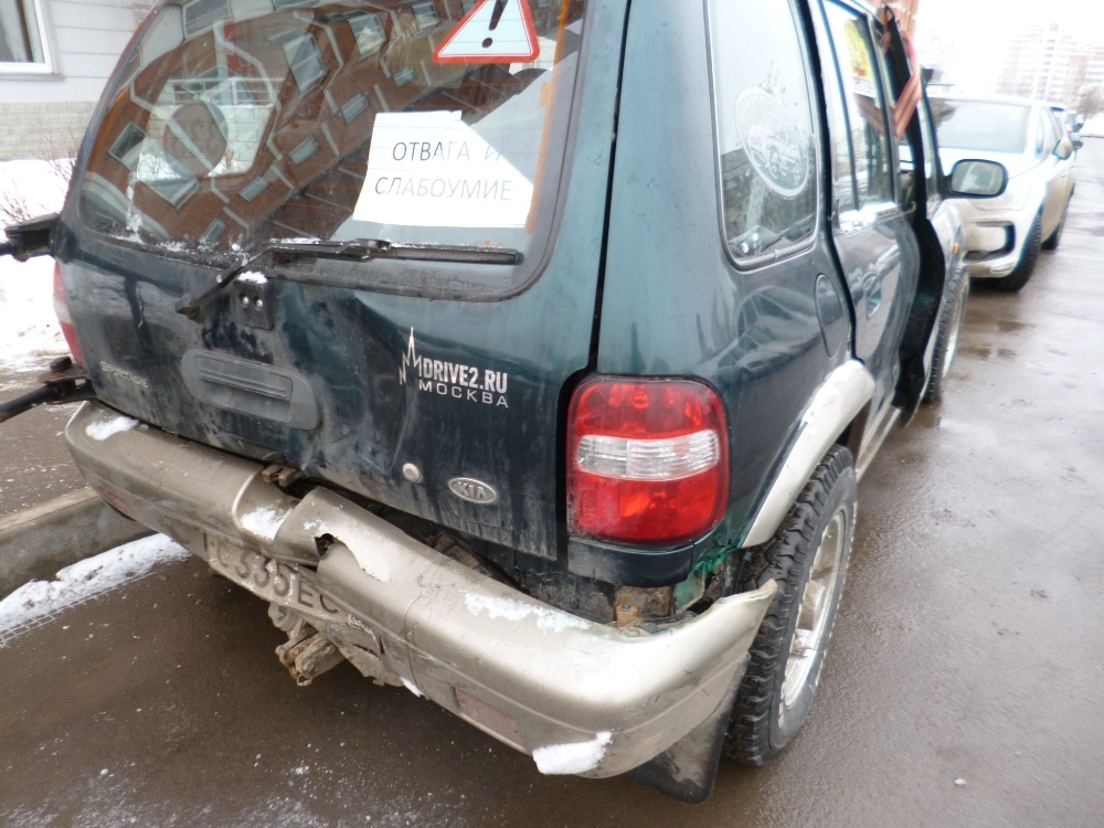 Продаю верного, коня, служил мне два года. до этого, служил моим хорошим знакомым. но, к сожалению зимой прилетела мне в зад другая киа(рио). пока суды, да дело, понадобились деньги и восстанавливать авто нет возможности, буду пересаживаться на всякие русские авто. Двигатель в идеале,как и коробка. Вся подвеска и тормоза новые. Также новый кардан, ручник, все масла поменяны и еще много чего нового. общее состояние кузов на 4- (сзади крылья чуть приболели). ну и соответственно весь задок надо восстанавливать и тянуть. Ну и ништяки: Летняя резина BFGoodrich AT 215/75r15 Зимняя Winterdueler плюс фары хела на бампере хочу за все добро 110 000 рублей Возможен торг. Дмитрий, 89060398799 Эскизы прикрепленных изображений -------------------- Спортаж J&, 2003 год, 2.0 бензин, зеленый, МКПП, BFG &T 215/75/R15, пока все но не собираюсь останавливаться