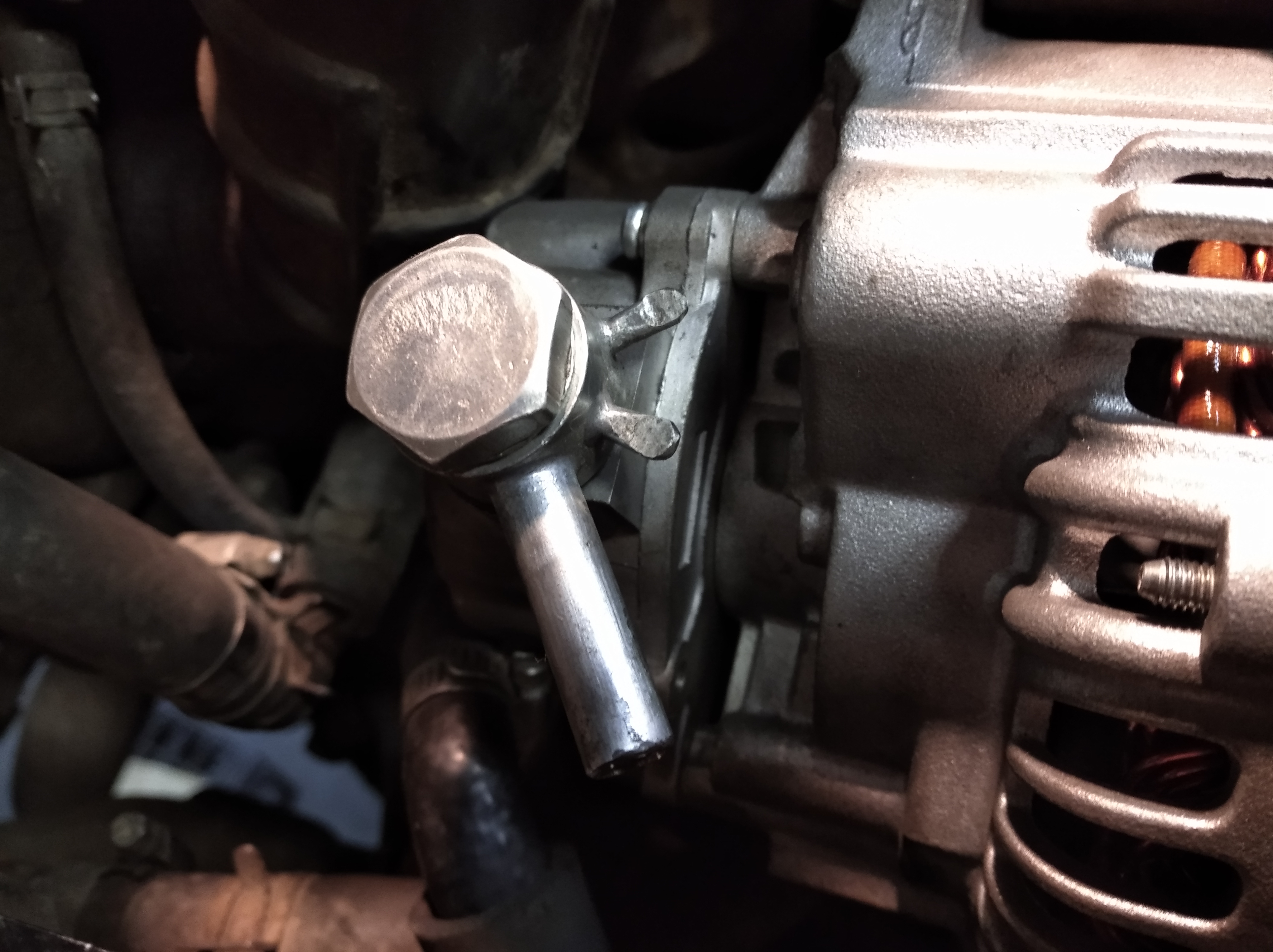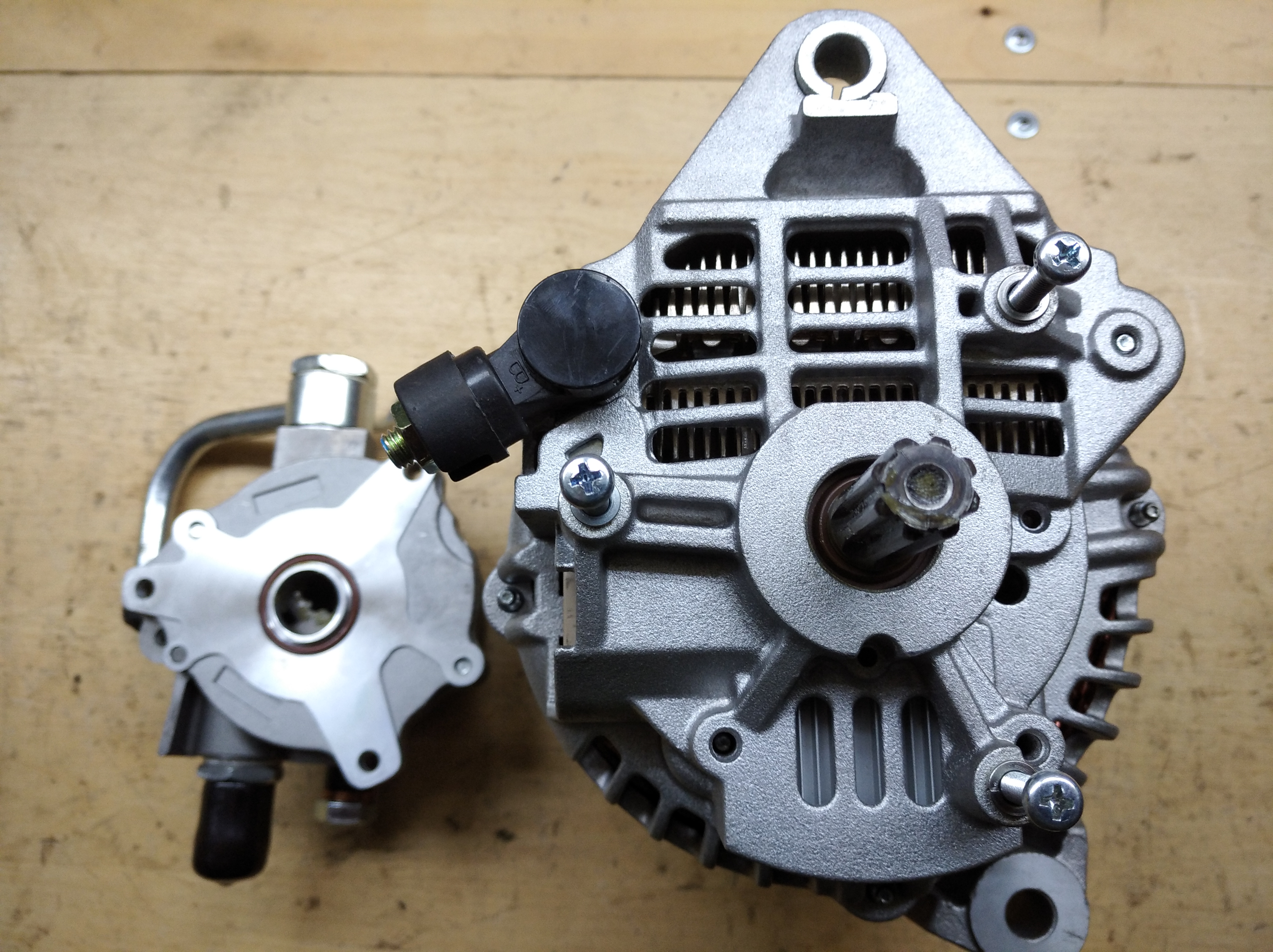 Сначала снимаем обгонную муфту. Для этого нужна специальная головка. На этом генераторе на валу отсутствует внутренний шестигранник, поэтому снимаем вакуумный насос и пытаемся удерживать вал за шлицы. Скажу сразу, что это бесполезно, даже в тисках через алюминиевые проставки, удалось открутить эту муфту только частично разделав её болгаркой. Заметьте, на НОВОМ! генераторе. Вакуумный насос можно развернуть как угодно - болты расположены под 120 градусов. Верхний патрубок вакуумника был безжалостно обрезан, а тонкие патрубки заплющены молотком Примеряем на место шкив от родного генератора почти подходит. Но без токаря не обойтись. Придётся снимать 5мм. Фото проточенного шкива выложу позже. Шкив пока в работе. Нижняя часть генератора располагается так. На фото видно расстояние между плюсовой клеммой и выхлопным коллектором, в предположительном положении генератора при натянутых ремнях. Вид снизу: патрубки подачи и слива масла находятся в нормальном положении. Старый натяжитель ремней не подойдёт. ...поэтобу был создан "новый", даже с натяжителем На этом пока работы приостановлены. Ждём токаря. У родного генератора я вычислил распиновку клемм. S и L. А вот на новом генераторе никаких обозначений нет. В интернете есть такая картинка -------------------- |