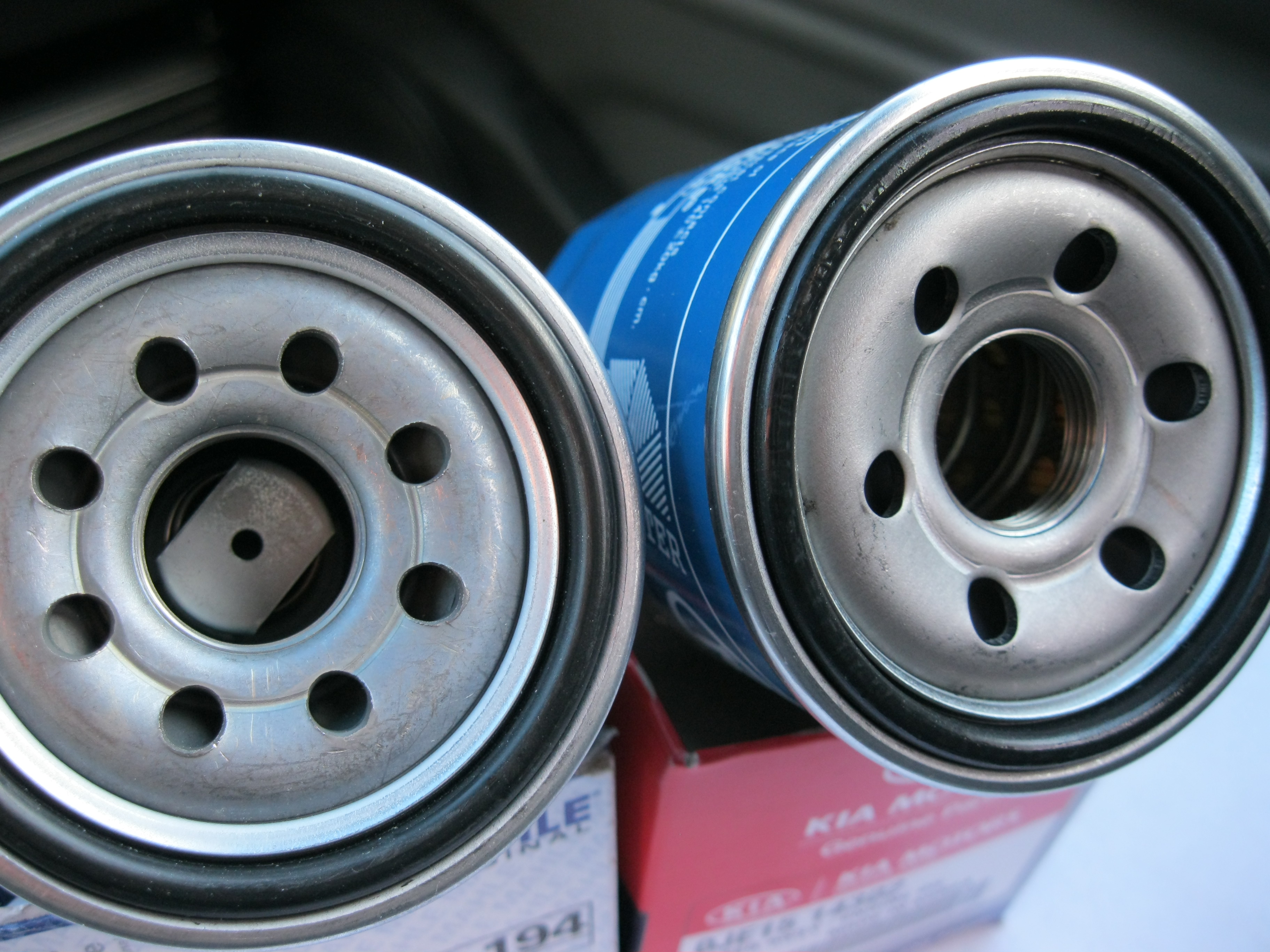 Мож кому интересно-сравнение масляных фильтров - оригинального KIA и MAHLE OC 194. Как видите различия в количистве отверстий и наличии у OC 194 клапана.