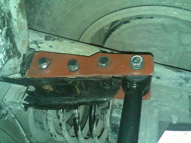 Сделал по месту кронштейны. Отрезал из трубы втулки для прочности. Тягу опустил на 5,5 см. есть один минус... это форма кронштйна (штатного)на кронштейне изгиб в сторону колеса... мы этот кусок отрезаем чтоб при артикуляции задней подвески амортизатор упираяс в кронштейн не гнулся... -------------------- |