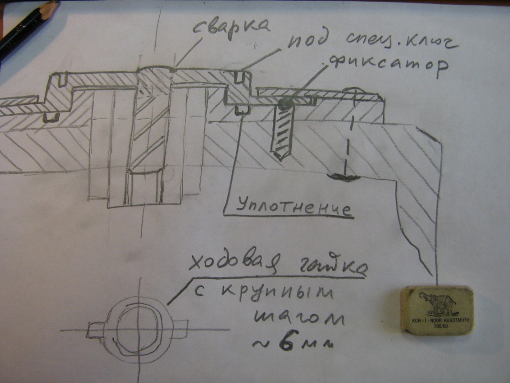 В ступицу наверное не попадет, а вот в хаб - свободно. Не только через центральное отверстие, но и через выбитые сбоку фильтры. Не знаю как насчет износа хаба, но ситуация, когда в заблокированный хаб попадает вода и там замерзает реальна. И хаб после этого выключить не удастся. Центральная вставка со штифтами никак не стопорится во включенном состоянии, т.е. выключиться и вывалиться ей ничто не мешает. Ну и на последнее. Крышка хаба алюминиевая, довольно хрупкая, я бы к ней никакие усилия не прикладывал, для этого и точилась внутрь шайба. А так, что сказать? Простота - это точно, но я бы так делать не стал. Если уж совсем нет никаких станков, проще перекинуть пружину хаба осенью и ездить до весны. Так надежнее. Я год так и ездил. Я на "Ваших болтиках" уже почти год отъездил. Всё нормально. Шайбу (которая закрывает удалённый фильтр) поставил на много герметика. Недавно снимал правый хаб - ни капли воды или грязи. Всё чисто. Щас обдумываю новую конструкцию с точёными деталями на базе винта с большим шагом резьбы (как на сверле примерно). Приятель купил станки - прям в гараже и поставили, с точением и фрезерованием проблем нет теперь. Вто что то вроде этого (как прикидочный вариант). -------------------- Sportаge 2005, гранд, МКПП, бензин, 128 л/с, 16 кл. Калининград, лето - BFGoodrich All Terrain - T/A LT215/75/15 KO2, зима Marshal- KC 11 215/75/15, шиповка, всё на нивской штамповке, стальное брюхо 4 мм из 4 частей, силовой передний бампер, хай-джек, лифт-мейт, хабы - болтики "а-ля Тамбов".