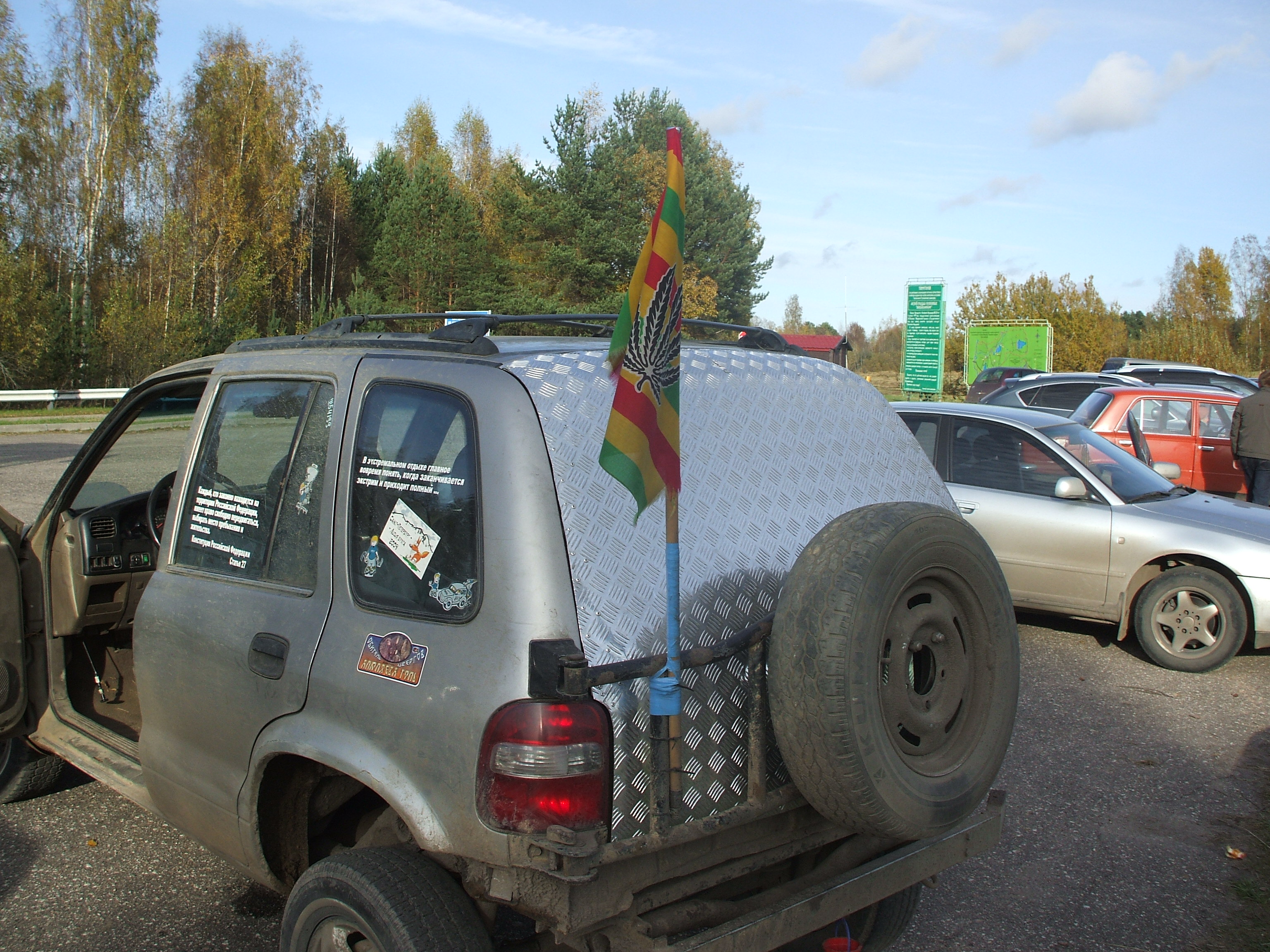 хотелось бы тонкостенную жестяную трубку, но не нашо лпока. втыкается между задним стеклоочистителем и калиткой. держится крепко - по городу норм ездить. флаг можно пришпилить мебельными гвоздиками или строительным степлером. на скорости до 60кмч он не сползает. развиватсья начинает от 10 км/ч. завтра фотку приложу - а то щас темно уже. длина флагштока над верхней трубой = высота флага + 10 см. над крышей флагшток торчит на 10 - 15 см примерно. к мешавам обязательно доделаю завтра постараюсь приспособить крепление съемное. пока что кроме как пропилить дырку в трубе калитки ничего не придумал. на сайте одном видел как челы флаги примотали изолентой к лесенке на ленгрузере: ![]() -------------------- |