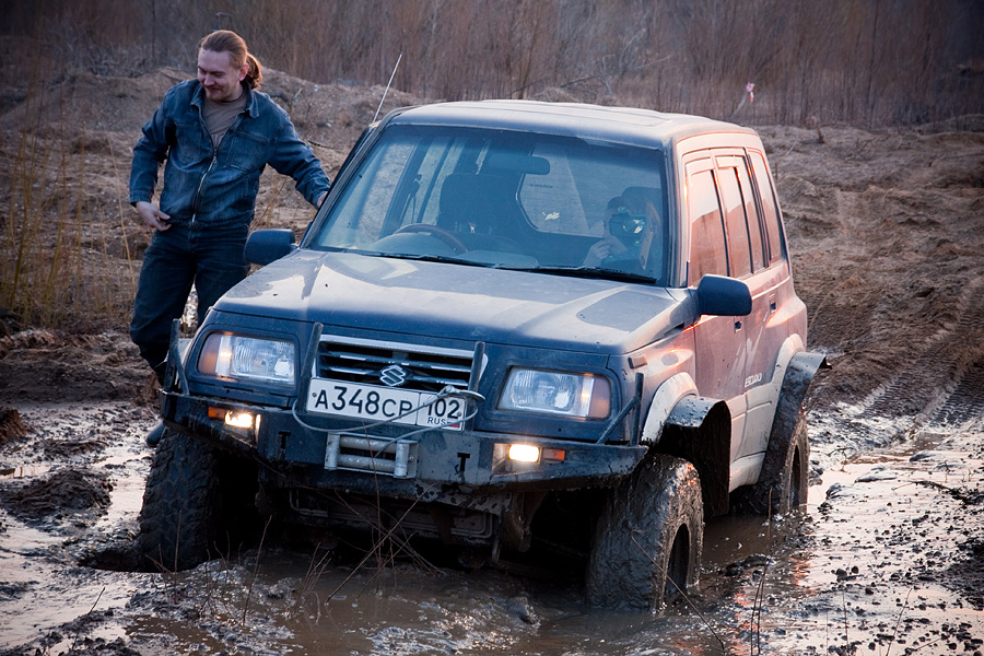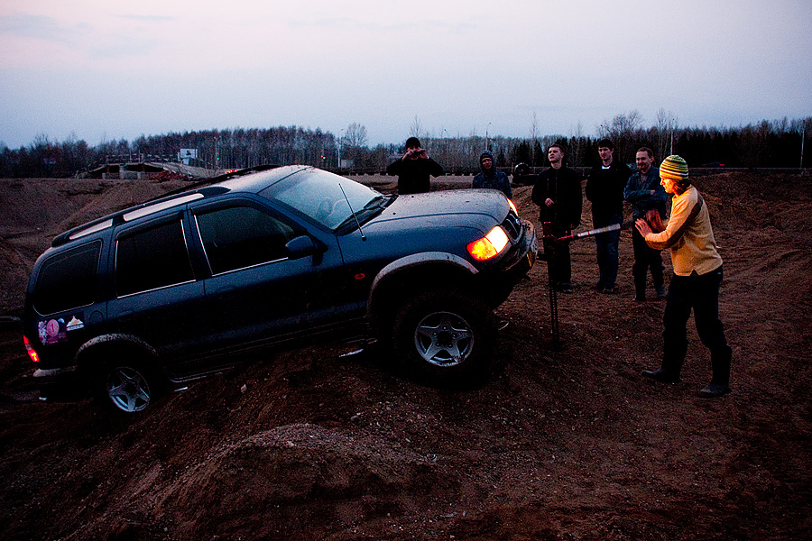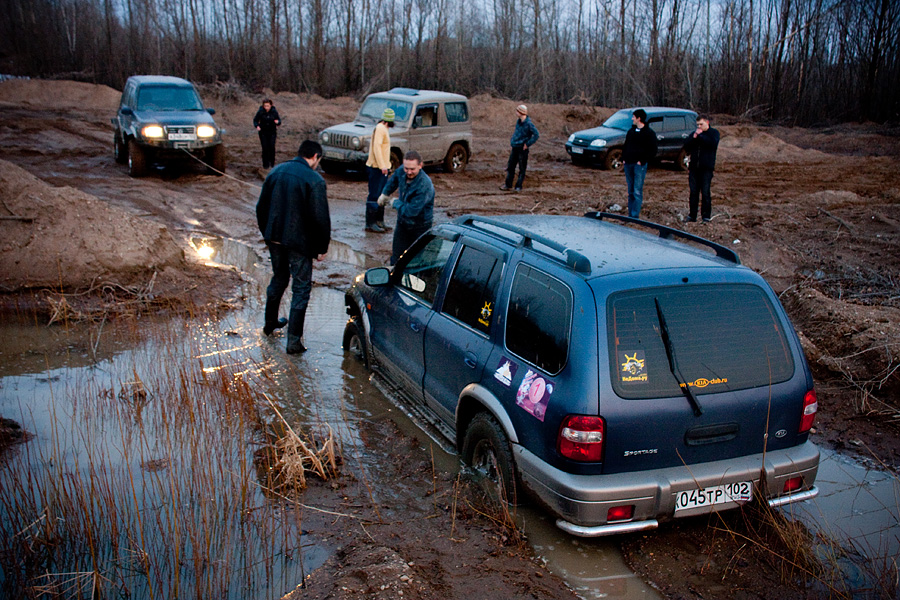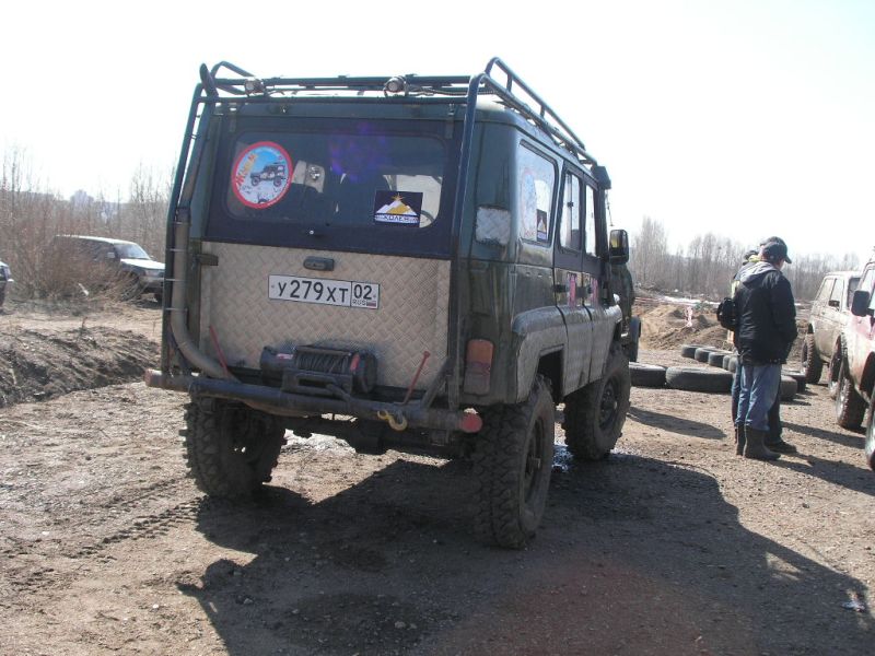 В прошлые выходные я принял участие в небольших соревнованиях на песчаном карьере под Уфой. Организовывал их внедорожный клуб "Колея", совместно с ТСС (обещали даже разряды присвоить). К сожалению, вся подготовка спортажа ограничилась только снятием скорлупы бампера и установкой колес 235/75 размерности (пилигрим). Орги обещали щадящую трассу, проходиму стандартом. По регламенту было три дистанции: триал - кольцо в 1 км по песчаному карьеру; спринт - змейка между конусов, обратная змейка задним ходом с заездом в гараж; слалом - тоже скоростная дистанция на асфальте, только включающая проезд по мостику, разворот и восьмрка в кругу из конусов, корридор прямой и с тремя поворотами под 90 градусов. Всего заявилось 12 участников, обычно на такие мероприятия приезжает больше народу, но тут видимо многих смутила необходимость получения мед. справки и страхования жизни на время соревнований. Основная масса - уазики, тройка нив, крузак 80 и спортяжка в стоке Поддержать меня приехал ИльдарМ, заодно он писал видео (обязательно выложу, как разберусь) и Фаниз (часть фотографий его) за что им большущее спасибо. Трасса триала была действительно несложной, но по мокрому песку было как-то неожиданно тяжело ехать, поэтому не раз приходилось переходить на пониженную и терять время. Изначально для себя решил не ломить, а просто проехаться, поэтому не торопился и даже разок заглох Уже после прохождения трассы всеми участниками народ стал просто катать. Основная масса пыталась выскочить в горку, с которой все стартовали. Удавалось это не всем и то, только с крепкого разгону и чуть-ли не выпрыгивания. Попробовал и я, только внатяг, ибо машинку пожалел... но неполучилось... спортяга ложился на перегиб пузом и терял момент, а выскакивать на асфальт я не стал. Сказываются мокрые амморты и отсутствие лифта... передние арки крепко обтерты, сзади ничего креминального обнаружено небыло. На времени прохождения триала сказались как моя бережливость, отсутствие опыта езды по таким грунтам, подготовка машины (пару луж преодолевал с опаской, но спортяга не подвел Но я оторвался на скоростных элементах, змейку задом вообще зачетно прошел, не сбив ниодного конуса (спасибо электроприводам зеркал и заднему приводу Довольный как слон -------------------- |