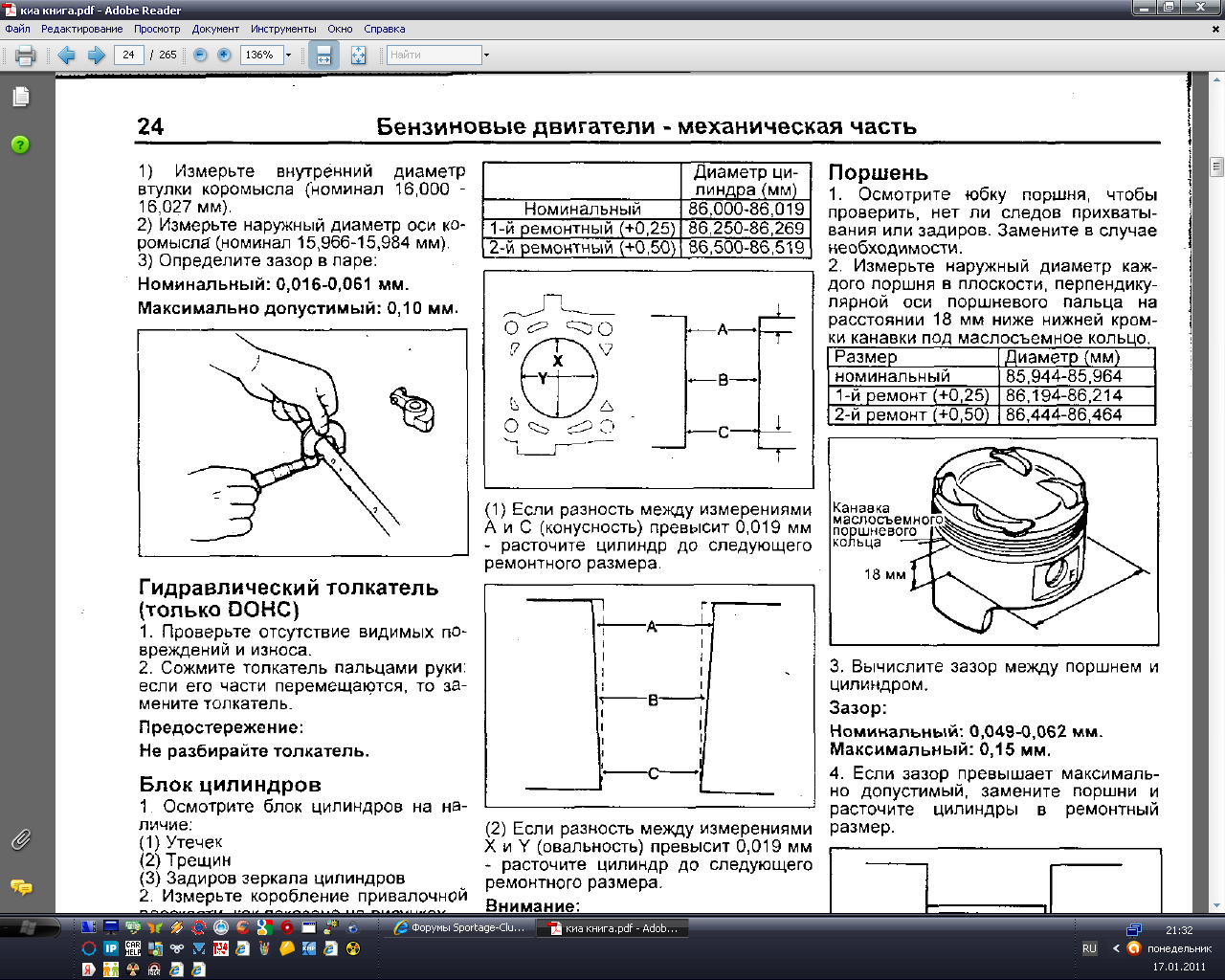 Диаметр цилиндра х ход поршня, мм 86.0 х 86.0 первый ремонт если я не ошибаюсь вернее по каталогу 86,5 замеряли юпку поршня вынутого 86,4. Следующий ремонтный размер 87.0 на складе нету будет через два дня. да вот еще списочек на минуточку. 1.Поршня размер следующий после 86.4мм. (стандарт 86, 86,5 (1вый рем) ,87 второй рем ) -------- 1 заказывать на послезавтра 620грн комплект (один поршень с пальцем и кольца 335 грн 2.Набор прокладок на весь двигатель. Полный комплект с сальниками тайвань 560 грн (оригенал 1500 грн но его нет) 3.Резинки подушек (подушки двигателя.) левая 125 грн правая 135грн ждать 3 дня. 4.Ролики натяжения ремня (ГРМ) правый левый. Дейко ГРМ (хороший) 131 грн Ролики натяжные ( промежуточный ремня ДжейБи (япония) – 145 грн, нятяжной ролик НСК - 120 грн. 5.Набор трубок на воду. Нету 6.Все гидрокомпенсаторы. Ина 88-84 грн штука ,попроще АЕ 80 грн штука 7.Вкладыши коренные и шатунные размер 0,25 либо следующий размер после проточки, вал надо промерять. На послезавтра коренные 220 грн а шатунные 130 грн 8.Набор сальников. В наборе прокладок 9.Корзина сцепления. Валио корея 255 грн. 10.Диск сцепления. Валио корея 270 грн. 11.Выжимной подшипник. Валио корея 112 грн. 12.Вилка выжимного подшипника (опция) 250 грн две недели поставка А мурзилко он чО пишет... ![]() ![]() -------------------- Алкоголь в малых дозах безвреден в любом количестве!