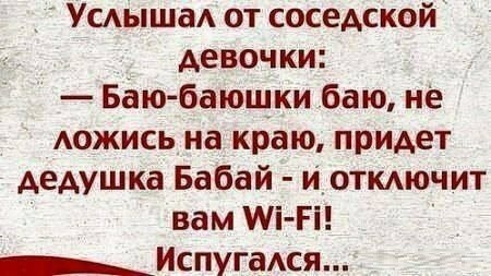 ![]() ![]() ![]() ![]() ![]() ![]() ![]() - Приходи, Иришка, вечером на сеновал. - Зачем? - Будем на сене валяться, самогон батин пить... Я тебе звёзды покажу, за попу потрогаю, если разрешишь... - А если не разрешу? - Ну... ещё самогону выпьем. На следующий день после ограбления банка грабители получили смс с условиями оформленного кредита Что-то начало болеть. Идешь к врачу. Он выписывает лекарство. Смотришь в интернете совместимость с алкоголем. Знаете, а не так уж и болит-то! ![]() ![]() ![]() ![]() ![]() -------------------- ![]() ![]() ![]() ![]() ![]() |