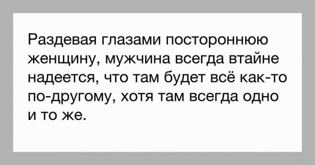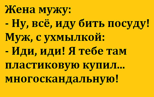 ![]() ![]() ![]() ![]() ![]() Было видно, что резюме Яше помогала писать бабушка, так как в графе "Недостатки" было написано "Плохо кушает". Умер старый еврей. Вскрыли его завещание, читают: Дочке Саре, оставляю 100 тыс. долларов и дом. Внучке Ривочке, оставляю 200 тыс. долларов и дачу. Зять Шмулик просил меня упомянуть его в завещании. Упоминаю: Привет тебе, Шмулик! - Дорогая, если я умру, ты не горюй, сразу замуж выходи. Будя счастлива. Единственная просьба - пусть дочерей правильно воспитает! - Как же ты задолбал!!!! Нормальный суп!!!! Не хочешь - не ешь!!!! Раннее утро, мужчина нежно обнял жену, прижал к себе, положил голову ей на грудь, ласково посмотрел в глаза и с улыбкой сказал: - Люська... Люська... сисястье ты моё... -------- - Девушка, а это платье Вас сильно полнит. - Ну слава Богу, а то я всё на булочки грешила... ------ Поругалась с мужем, психанула, ушла из комнаты на кухню, села там на табуретку. Так он туда пришёл, взял меня на руки, как в своё время на свадьбе, принёс обратно в комнату, положил на кровать. Ну, думаю... А он снова уселся за компьютер, ласково сказав при этом: - Злись тут... Чтоб я тебя видел! - Дядя Мойша, что там вы можете сказать за пирамиду МММ ? Это, прибыльно? - Сёма, не смеши мне мозг! Самая большая пирамида, это пенсионный фонд России! Вкладывают все, а получают выжившие ... ![]() ![]() ![]() ![]() ![]() -------------------- ![]() ![]() ![]() ![]() ![]() |