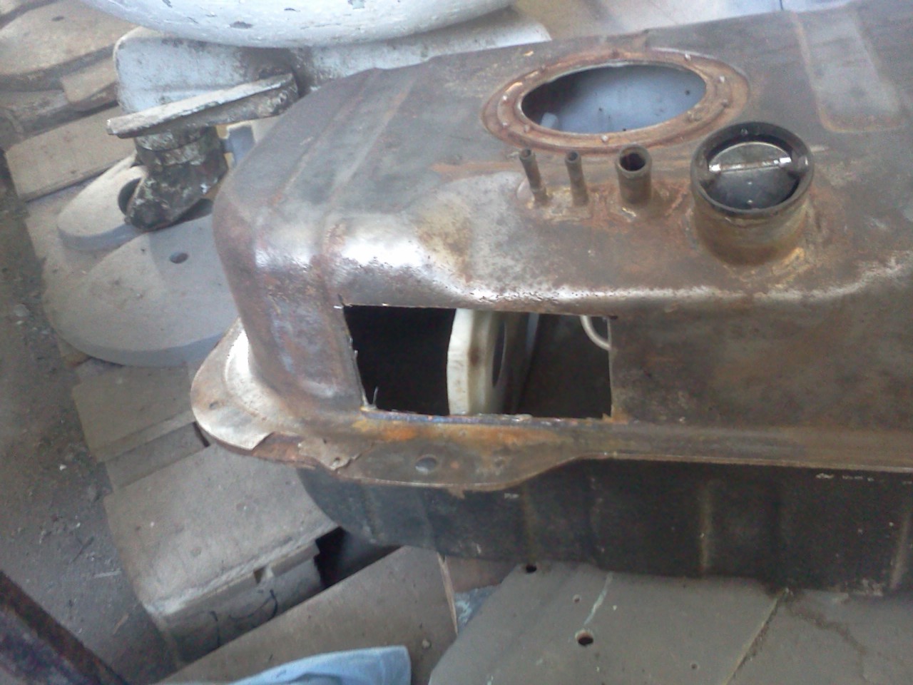 Главное это то, что всё не так страшно оказалось, как может показаться. Всё делается даже без домкратов и подъёмника. Сзади под задние колеса подложил доски толщиной 50мм, а под концы досок подложил по чурбаку миллиметров 250 диаметром. Задним ходом заехал на эти импровизированные "горочки", и этого оказалось предостаточно для съёма бака. Отвернул сливную пробку, слил бензин в тазики, потом отвернул бак с защитой, вынул его на свет божий. Снял защиту...и вот какая беда: - зазор между защитой и задней стенкой бака оказался забит землей. Антикоррозийное покрытие с бака в этом месте отслоилось и влажная земля сделала свое страшное дело - задняя часть бака жесточайше изъедена раковинами коррозии. Пара таких раковин оказались сквозными. Решил паять... но заливать бак водой, пропаривать и прочее...желания не было. Вынул сборку насоса и оставил бак на солнышке прокалиться. Через три часа бак оказался абсолютно сухой и главное -тёплый. Зашкурил - зачистил проблемные и подозрительные участки, выскребать каждую раковинку на поверхности не стал. Просто залудил паяльником и залил припоем погуще эти места в два слоя, и все раковны просто залились припоем поверху. Никакого сверхмощного паяльника не понадобилось, обычный 100 ваттный и паяльный жир. Главное - хороший легкоплавкий припой (взял типа кадмированного ПОСК-60), и он "побежал" как вода, пришлось даже понизить температуру паяльника. Двадцать минут - и готово! Промазал для спокойствия бак густым мовилем, и поставил на место. ВСЁ |